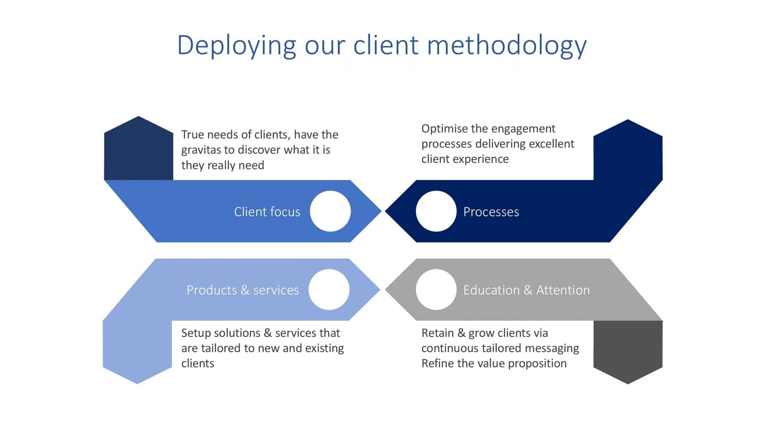 We challenge your goals to agree future business priorities. We’ll map your internal processes, skills, offerings and process. Identifying where we will make an impact while solving client’s needs. We work with you to refine the 'as is' creating new propositions to meet growth goals